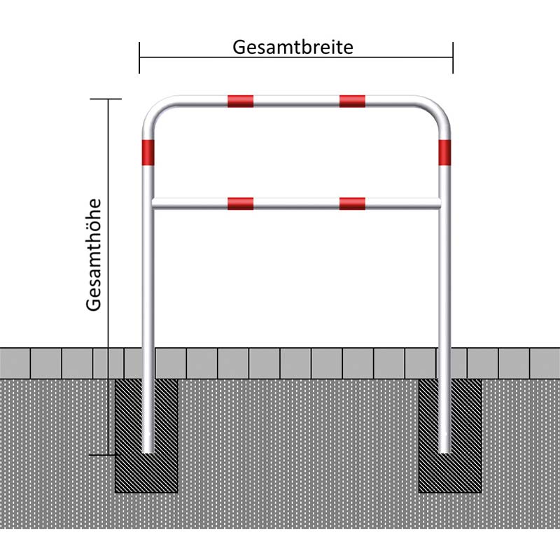 Die zweibeinigen Absperrbügel betonieren Sie im Boden ein. Als Auszugssicherung aus dem Betonfundament liefern wir Ihnen 2 Erdanker aus Rundstahl mit. Die Löcher im Rundrohr unten sind entsprechend vorgebohrt. Wollen Sie die Absperrbügel nach Bedarf entfernen können, empfehlen wir die Montage in Bodenhülsen.