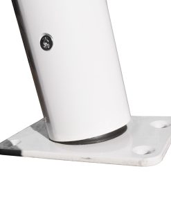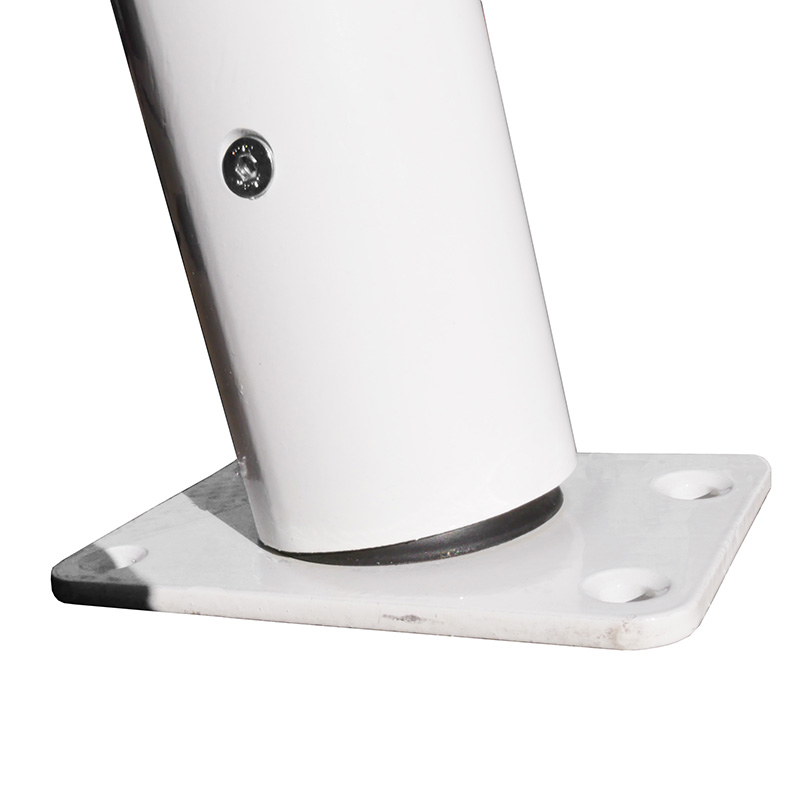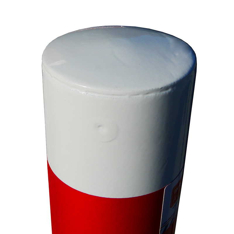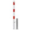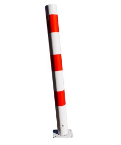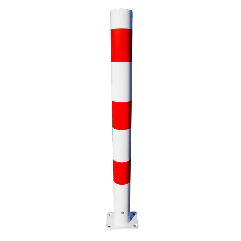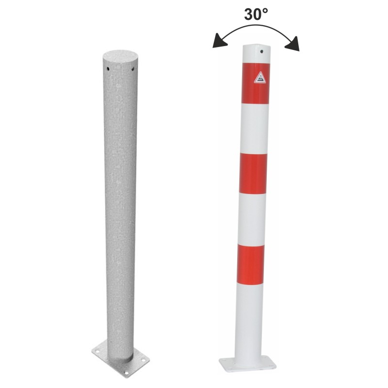 Der neigbare Absperrpfosten besteht aus feuerverzinktem Stahl, der je nach Modell zusätzlich weiß beschichtet ist. Die drei roten Reflexstreifen Klasse RA 1 erhöhen die Sichtbarkeit deutlich.