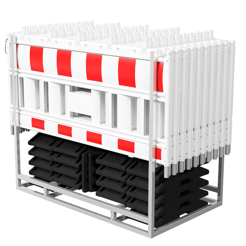 Die 21 Fußplatten mit 28 kg Gewicht halten sich durch die Arretierung in der Palette. Die 20 Absperrschrankengitter werden durch vier herausnehmbare Holme gehalten. Sie sind zur Anbringung von Warnleuchten mit Lampenadaptern ausgestattet.