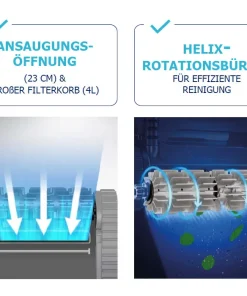 Die patentierte Zyklontechnologie ist leistungsstark und langlebig. Die Helix Rotationsbürsten, die große Ansaugöffnung sowie die zweistufige Filtration sorgen für effizientes ansaugen auch von feinsten Verschmutzungen.