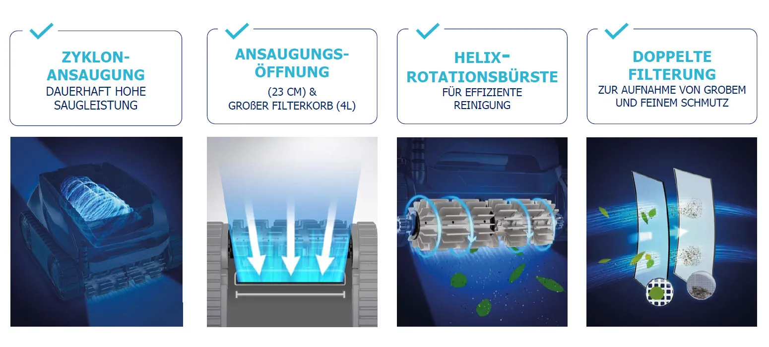+ Zyklon-Performance: Patentierte Zyklontechnologie / Agile Fortbewegung / Helix-Bürsten