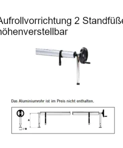 Die Aufroll-Vorrichtung besteht aus einem stabilen, eloxierten Aluminium-Tragrohr und ist inklusive Kurbel. Bei speziellen Größen kann das Rohr individuell durch Abschneiden angepasst werden. Die Halterungen sind nicht im Lieferumfang enthalten.