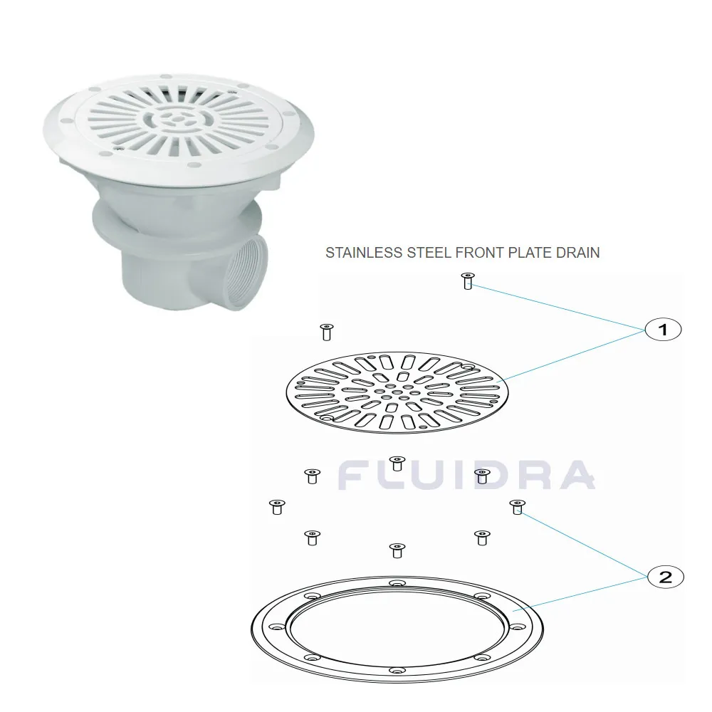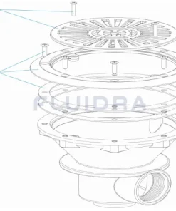 Aus weißem ABS. Besondere UV-Schutzbehandlung des Ablaufs. Der Ablauf saugt Wasser aus dem tiefsten Teil des Poolbeckens an, damit es vollständig recycelt werden kann. Er spielt auch eine wichtige Rolle bei der Entleerung des Pools. Die neueren Modelle sind mit einem Gitter ausgestattet, das den Gesundheits- und Sicherheitsstandards entspricht, die vorschreiben, dass die Öffnungen weniger als 8 mm breit sein dürfen, damit sich die Badenden nicht die Finger darin einklemmen können.