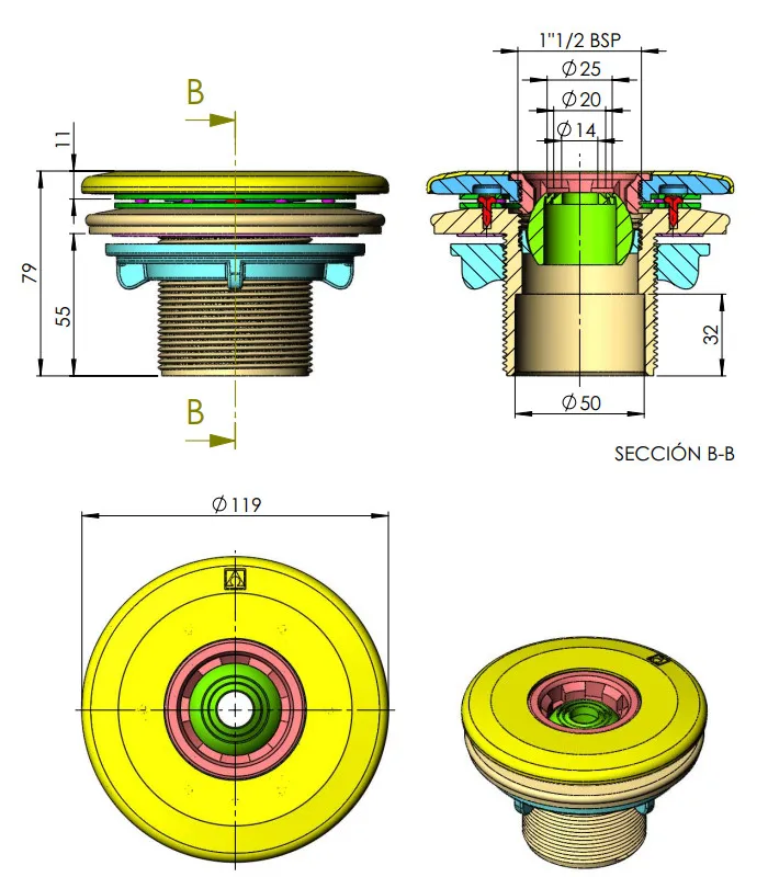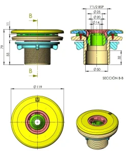 – Rücklaufdüsen: mit oder ohne Gitter erhältlich. Einlaufdüsen mit Gewinde haben einen Auslauf von 2“ und einen anderen Innendurchmesser. Die vorhandenen Gewindemodelle sind eigens für vorgefertigte und Liner-Pools designt und umfassen Dichtungen und Schrauben.