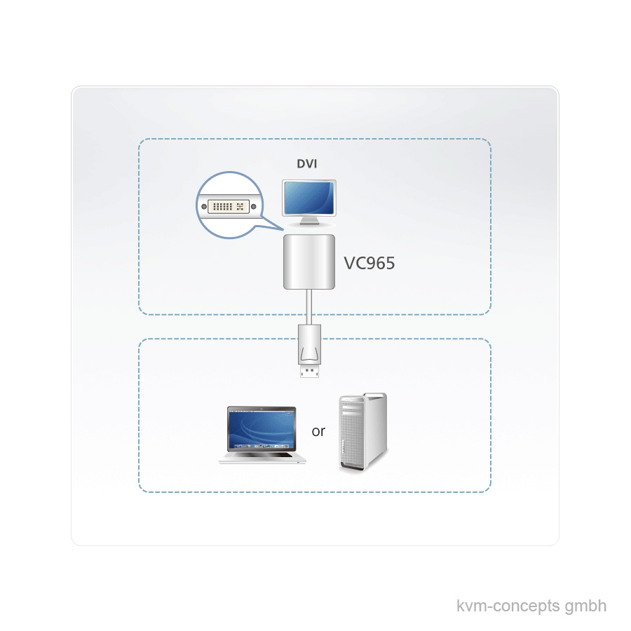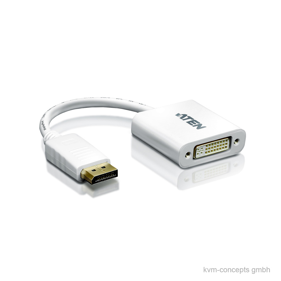 Der ATEN VC965 ist ein DisplayPort auf DVI Video Konverter, mit dem Sie den DisplayPort Ausgang Ihres Gerätes mit einem DVI Eingang eines Fernsehers oder anderen Monitors verbinden können.