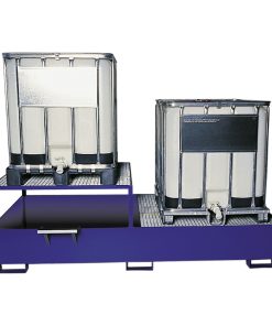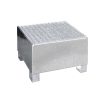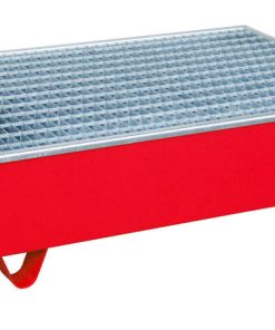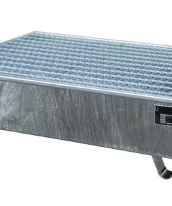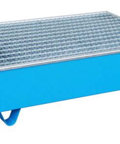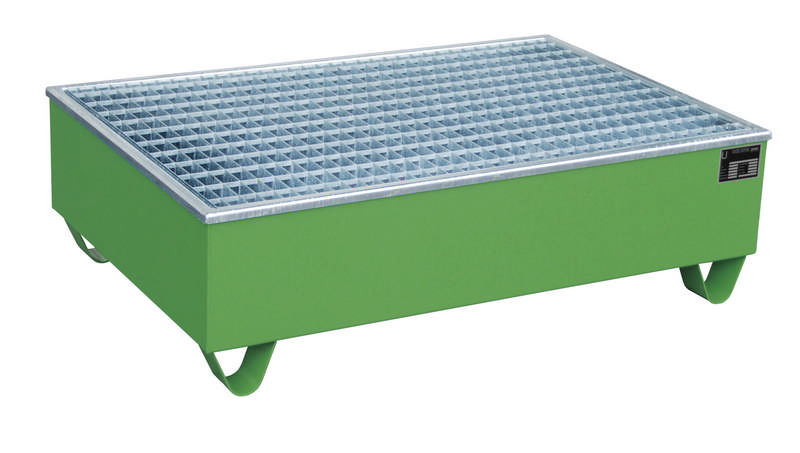 Lagerung von Fässern à 200 Liter mit aggressiven Medien —- Konstruktion aus 3 mm Stahlblech — 100 mm Unterfahrhöhe — PE-Kunststoffeinsatz — Klemmrahmen — Verzinkter Gitterrost (Tragfähigkeit 1000 kg/m²) — Mit Übereinstimmungserklärung (ÜHP) gem. StawaR — Zugelassen für entzündbare Flüssigkeiten der GHS-Kategorien 1-3 — Zugelassen für gewässergefährdende Flüssigkeiten der GHS-Kategorien 1-4