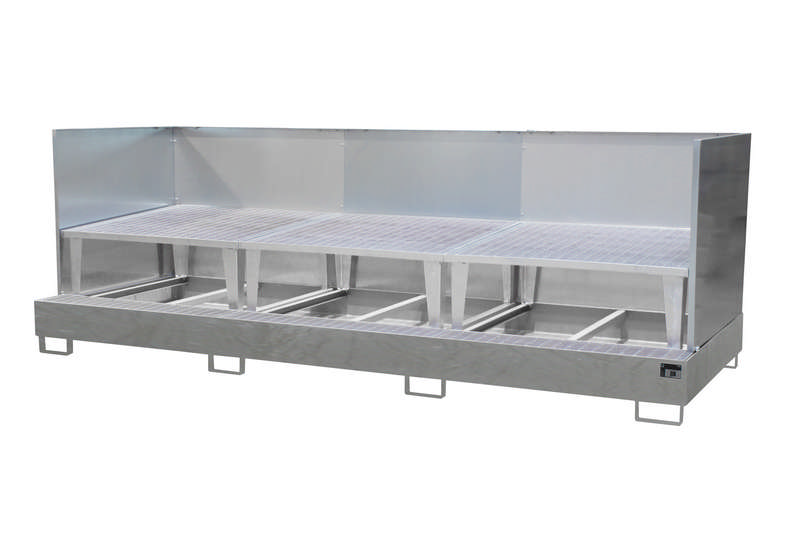 Auffangwanne Typ AWA 1000-3/SW, mit 3-seitiger Spritzschutzwand, mit 3x Abfüllaufsatz, max. Anzahl 3x1000l-IBC, versch. Farben o. Feuerverzinkt
