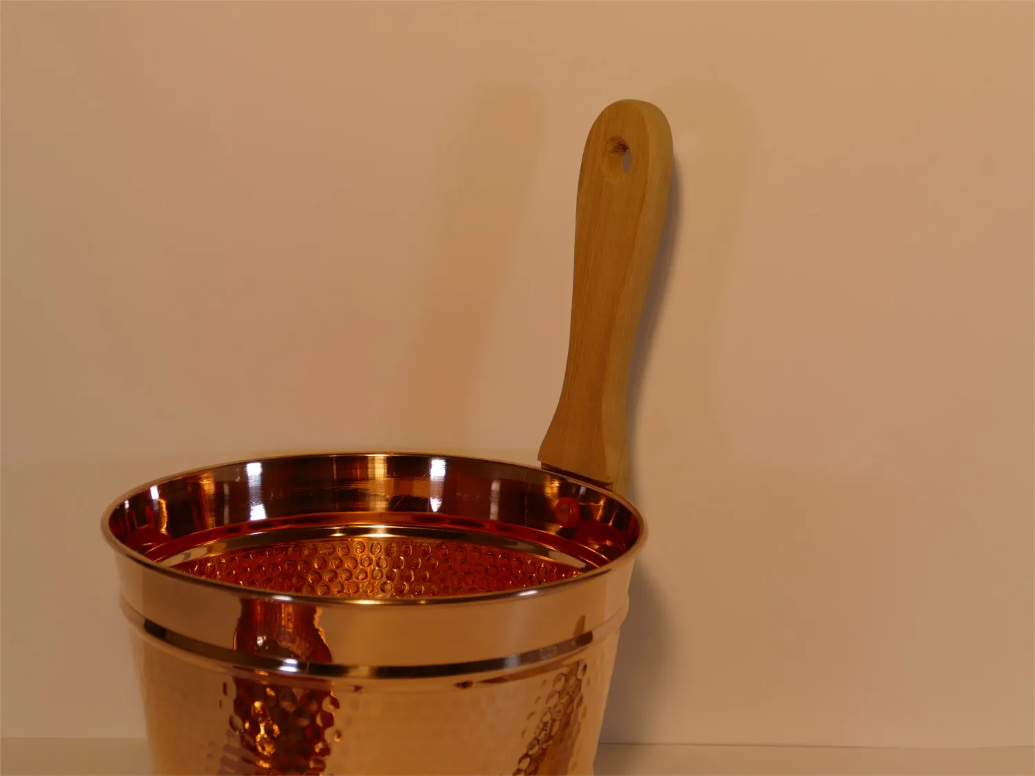 Wunderschöner Saunakübel aus Kupfer, mit stabiler Wandbefestigung aus Holz und einer praktischen Schöpfkelle.