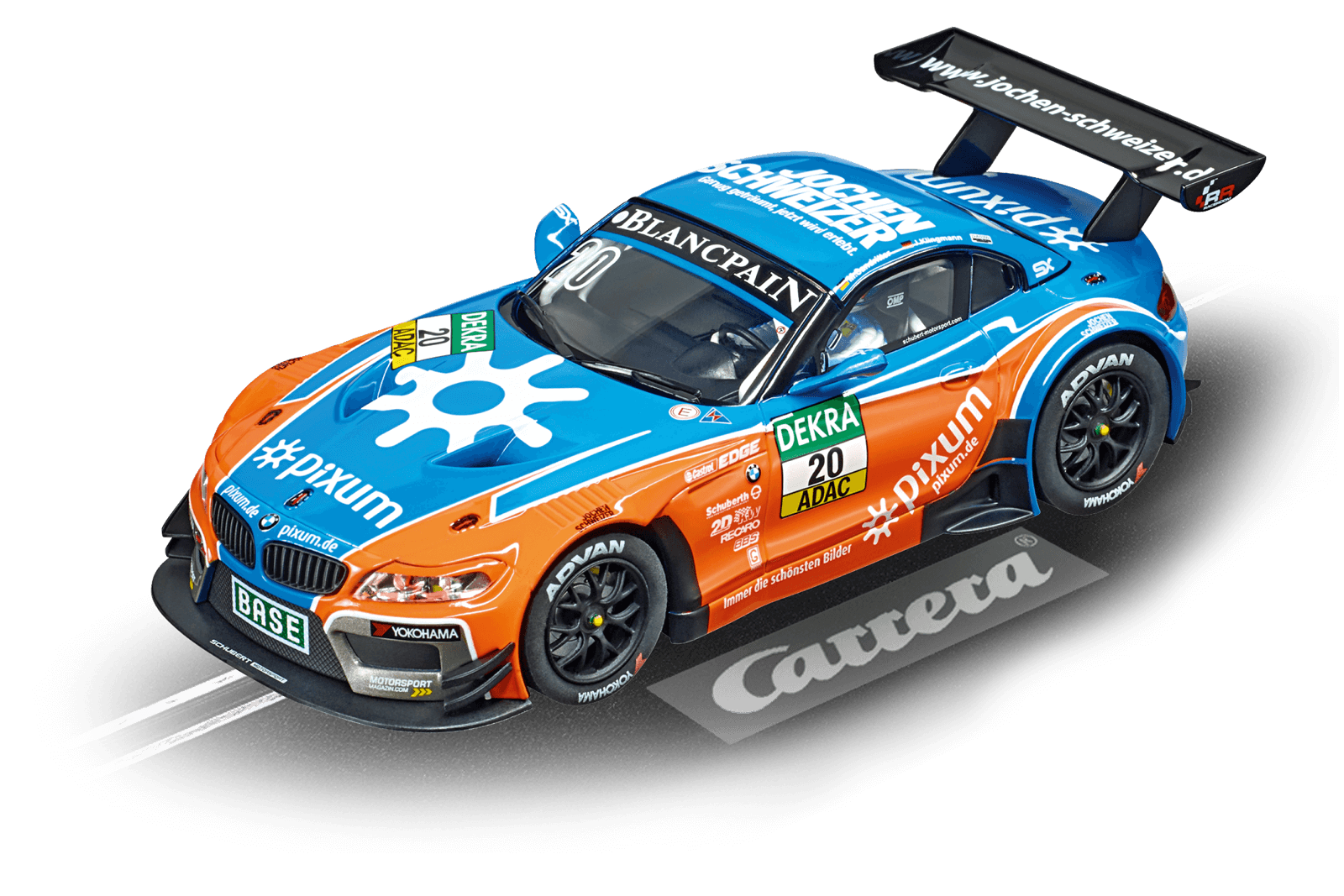 2014 startete der deutsche Rennfahrer Max Sandritter vom mit dem BMW Z4 GT3 mit der Startnummer 20 durch. Ein Bolide, der im Gedächtnis bleibt – auch, aber nicht nur wegen seiner auffälligen Lackierung. Ausgestattet mit einem starken 8-Zylinder-V-Saugmotor und ca. 535 Pferdestärken, entspricht der Z4 allen Maßstäben um mit Recht in der Liga der Supersportwagen mitzufahren. Das Carrera DIGITAL 132 BMW Z4 GT3 “Schubert Motorsport No.20” Slotcar begeistert durch Frontlicht und Rück- / Bremslicht sowie eine originalgetreue Verarbeitung. Das Carrera Auto ist individuell codierbar, digital steuerbar und bietet echten Fahrspaß.