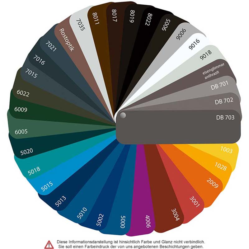 Das verzinkte und beschichtete Material dieser Bodenrosette für Pfosten zum Anschrauben ist langlebig und macht auch optisch einen hochwertigen Eindruck. Wir bieten Ihnen die Bodenrosette in vielen verschiedenen RAL Farbtönen an. Schauen Sie sich gerne unseren Farbfächer an!