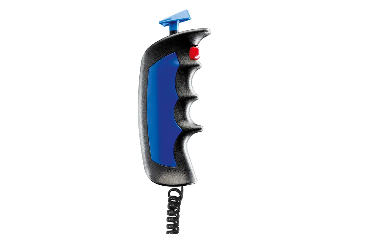 1 Daumendrücker mit Anschlusskabel und blauem Druckknopf