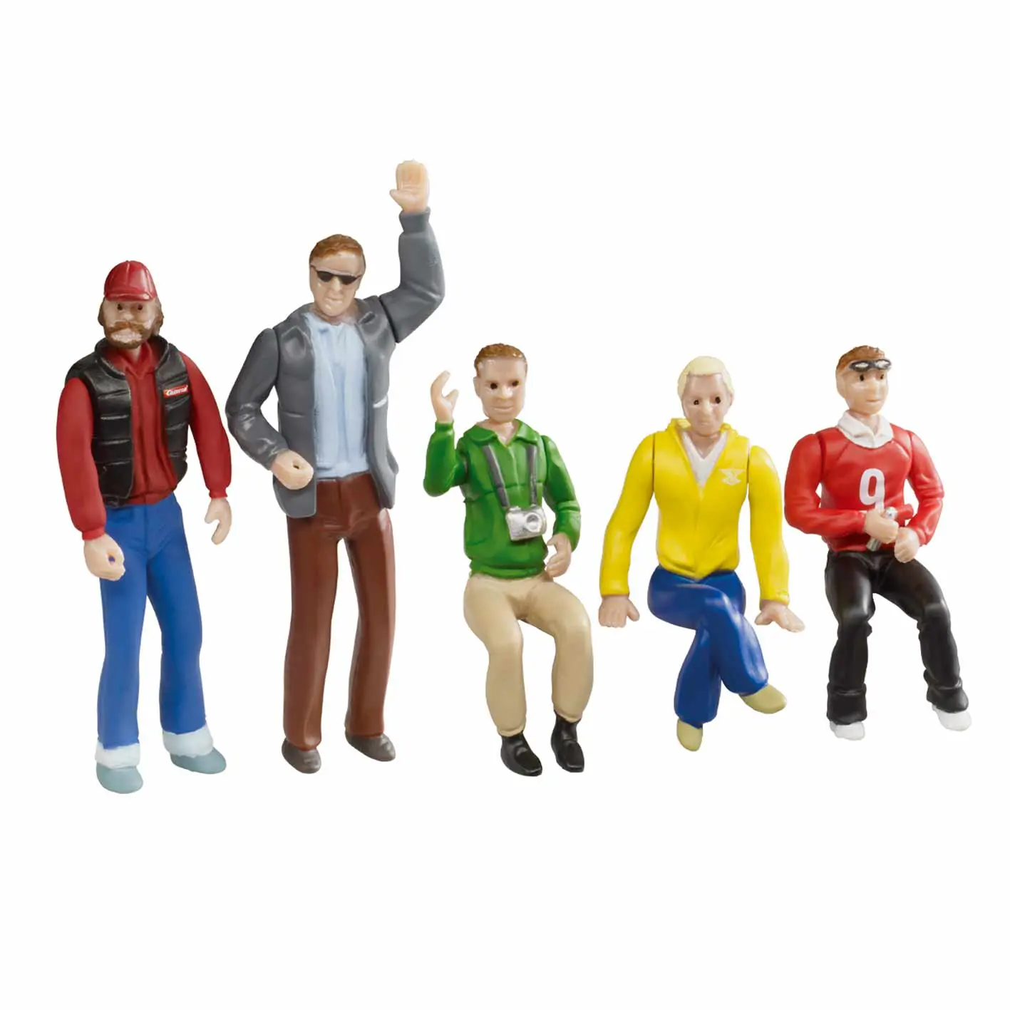 Moderne Dekorationsmöglichkeit für die Rennbahnstrecke! Die Ausarbeitung der colorierten Figuren ist extrem detailgetreu und es gibt verschiedene, positionierbare bzw. drehbare Körperteile! Der kleine Figurensatz besteht aus 5 Figuren: 3 sitzende Figuren 2 stehende Figuren