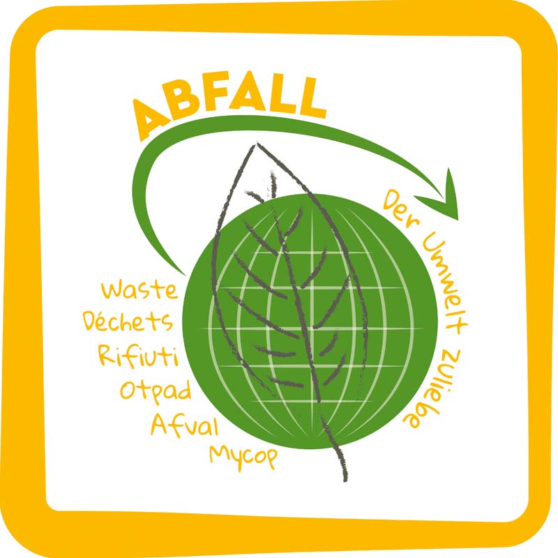 Durch seine transparente Klebefolie verdeckt der Abfallaufkleber nicht die Behälterfarbe. Durch den Aufkleber “Abfall-Der Umwelt zuliebe” mit Pfeil wird zum Einwerfen des Abfalls und Müll in die Sammelbehälter aufgefordert und hingewiesen.