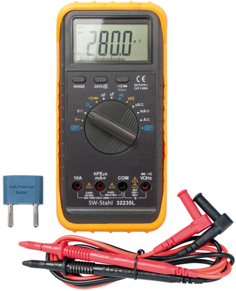 Akustischer Durchgangsprüfer, Transistorprüfung, Kapazitäts- und Frequenzmessung, Daten-Halte-Funktion, automatische Bereichswahl.