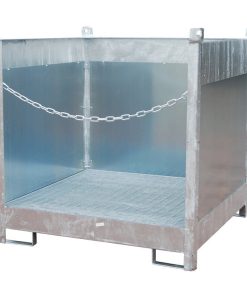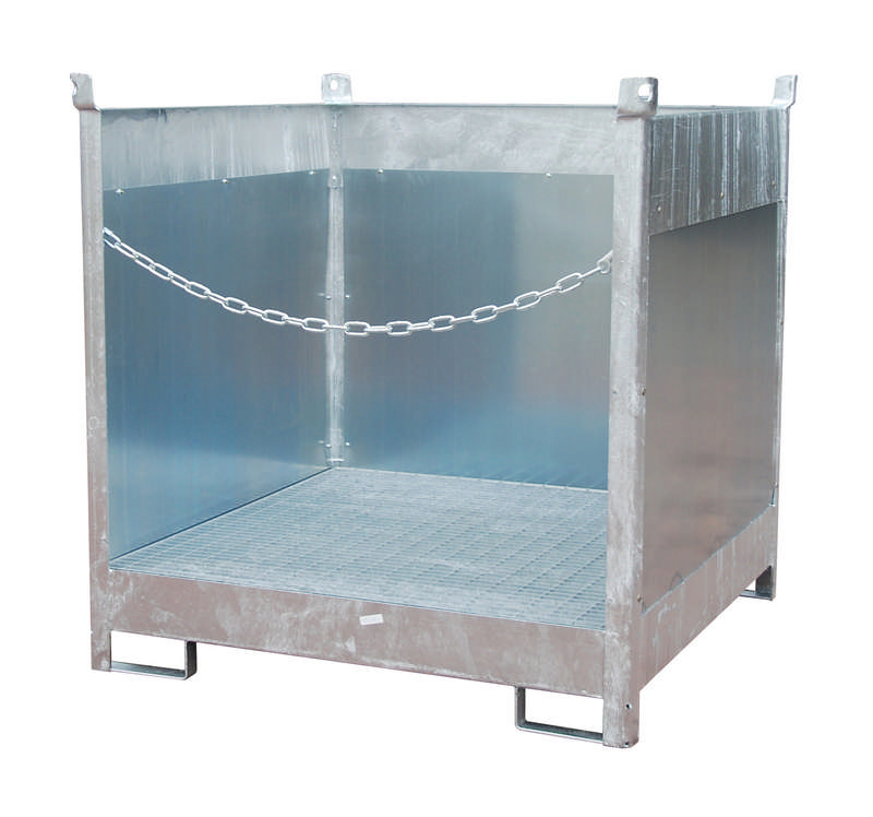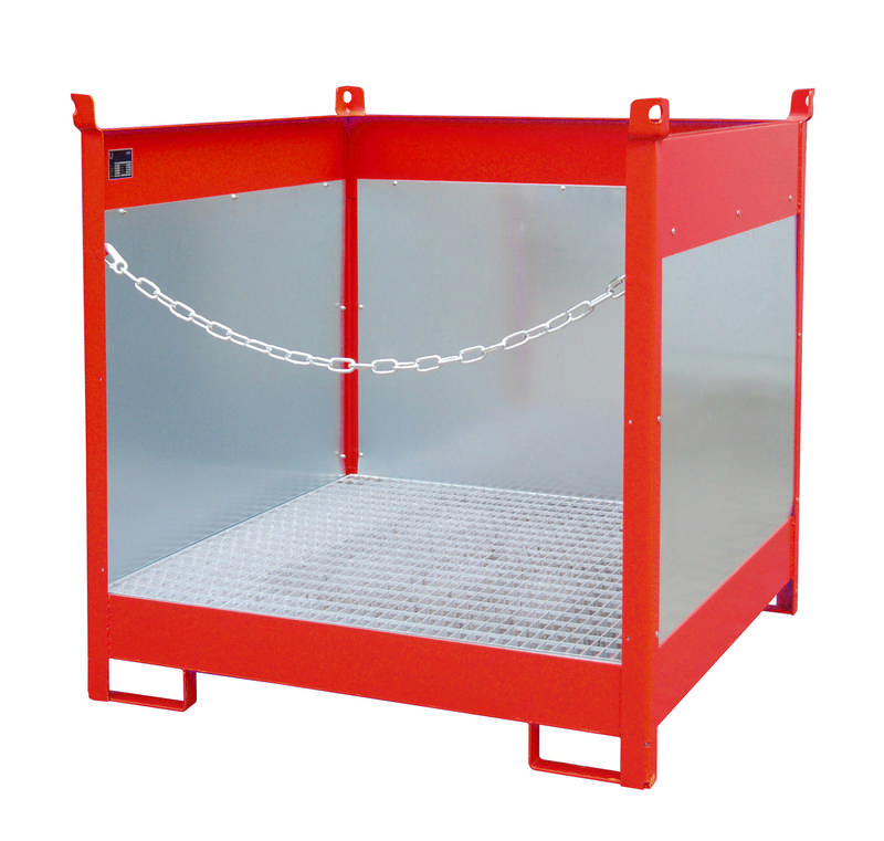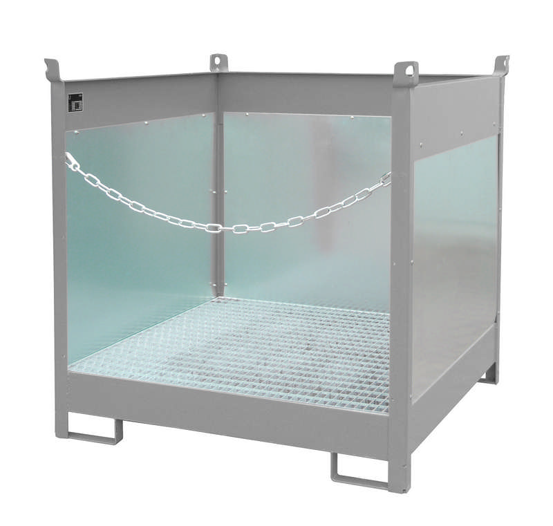 Fass-Stapelpalette Typ FSP-4G, Maße (LBH) 1410 x 1410 x 1435 mm, mit Gitterrost, Spritzschutzwand 3-seitig, 220L Auffangvolumen, für 4x 200L Fass, 3-fach stapelbar, Gewicht 204kg lackiert/224kg verzinkt
