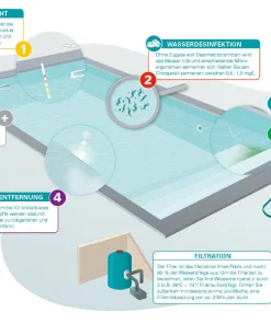 Zum Reinigen der Schwimmbeckenwände ist die Wasserlinie entsprechend abzusenken. Versehentlich ins Schwimmbeckenwasser gelangtes Produkt kann, je nach Menge, den pH-Wert verändern und zur Schaumbildung führen.