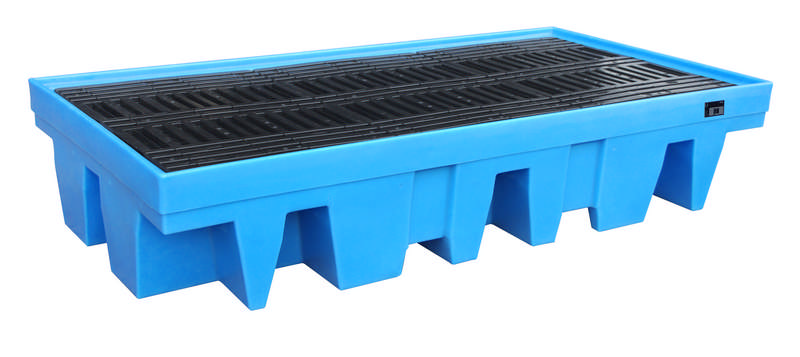 Sichere und vorschriftsgemäße Lagerung von 1000-l-IBC —- Konstruktion aus robustem Polyethylen — Beständigkeit gegen Säuren, Laugen und Öle sowie weitere nicht entzündliche Medien — Aufnahme für Gabelstapler — PE-Palette für Fässer oder IBC mit Holz-, Kunststoff- oder Stahlrahmenpalette — Mit allgemeiner bauaufsichtlicher Zulassung DIBt, Berlin — Zugelassen für gewässergefährdende Flüssigkeiten der GHS-Kategorien 1-4 — Zugelassen für ätzende Flüssigkeiten der GHS-Kategorie 1