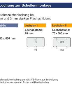 Gerne Lochen wir die Verkehrsschilder der Bauarten 2 mm nach Lochplan I (Lochabstand 70 mm) oder Lochplan II (Lochabstand 70 – 700 mm) für die von Ihnen gewählten Schilderschellen für die Verkehrszeichenmontage am Rundrohrpfosten oder Schildermasten. Selbstverständlich können Sie die Straßenschilder auch ohne Lochung bestellen – dies ist als Standard bei der Variantenauswahl bereits hinterlegt. Bitte beachten Sie hierzu auch unsere weiterführenden Informationen direkt neben der Variantenauswahl „Lochung“ (bitte direkt auf den Info-Button klicken).