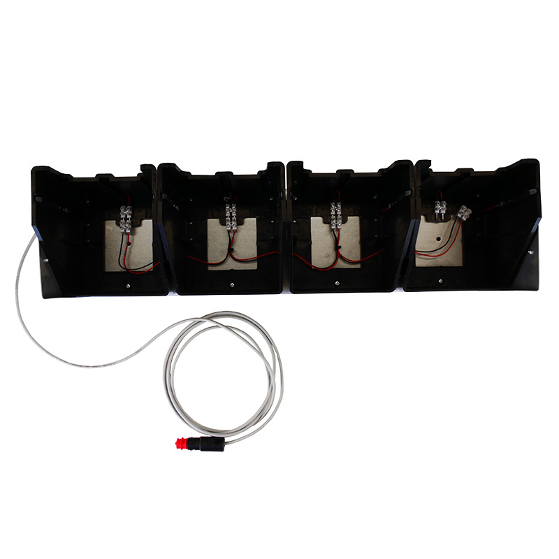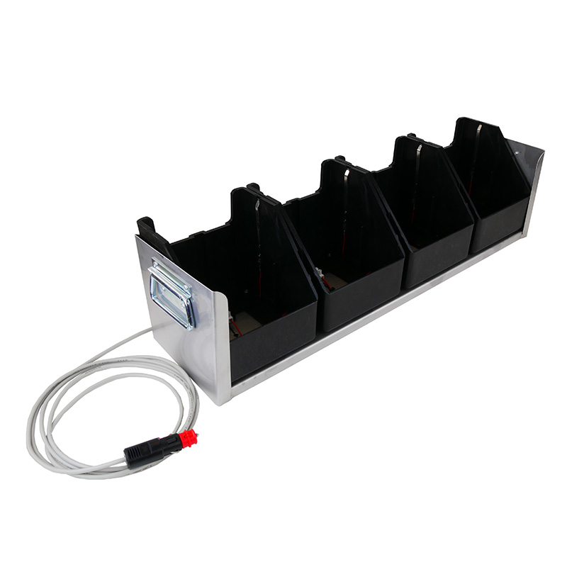- Kapazität für bis zur 4 Akku-Leuchten des Typs Euro Blitz LED und Euro Blitz Synchron LED, in einer Reihe nebeneinander