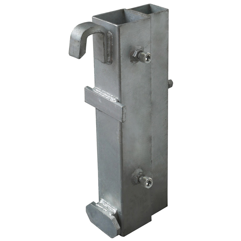 Der Vorteil dieses Schutzplankenhalters liegt in der Schaftrohraufnahme für 2 Größen: Für die Abmessungen 60 x 60 mm und 40 x 40 mm nebeneinander.