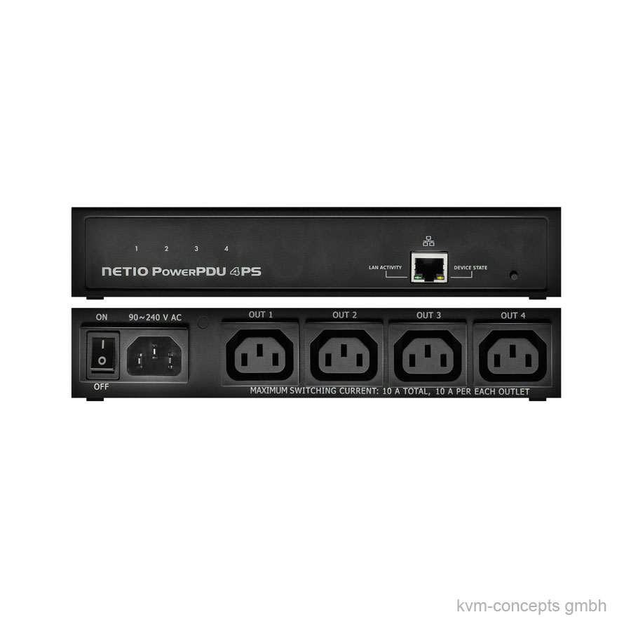 NETIO PowerPDU 4PS CH ist eine intelligente PDU (Power Distribution Unit) mit vier Steckdosen (4x IEC-320 C13). Jeder Ausgang kann einzeln ein- und ausgeschaltet werden. NETIO PowerPDU 4PS CH kann in Rackschränken montiert werden – horizontal, vertikal oder als 1U-Gerät.