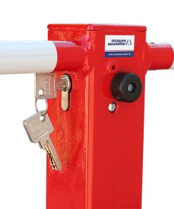 Die anfahrsichere Parkplatzsperre in Rot mit weißen Reflexstreifen hat eine Bodenplatte zum Aufdübeln sowie ein Profilzylinderschloss. Die Überfahrhöhe im umgelegten Zustand beläuft sich auf 95 mm. Nach dem Aufrichten rastet der Kipppfosten ein und verriegelt dabei automatisch.