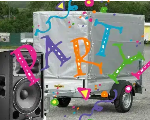 Partyanhänger zum mieten HA 132513 K, 1300 kg, kippbar, Kastenanhänger, Mietanhänger, Biergarnitur, Teufelbox, Stehtische,
