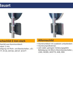 Alle Bauarten bestehen aus leichtem und rostfreiem Aluminium. Unsere Straßenschilder erhalten Sie mit einer Verkehrszeichenfolie in der Reflexklasse RA 1 nach DIN 67520 – für eine optimale Verkehrssicherheit.