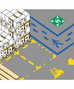 Markieren Sie mit dem Schablonensatz KIT Industrie von AMPERE Parkplätze, Stellflächen, gesperrte Bereiche, Fußgängerwege, Hinweise für den Gabelstaplerverkehr, Sammelplätze bei Gefahren und Richtungsangaben.