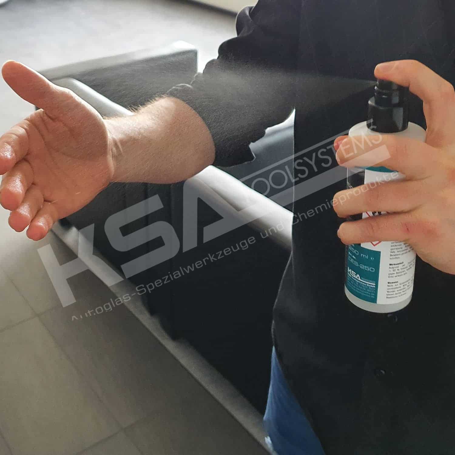 Handliche, leere Sprühflasche mit 250 ml Volumen aus High-Density-Polyethylen PE-HD, zum befüllen mit Flüssigkeiten wie z.B. Handdesinfektionsmittel oder ähnlichen, nicht ätzenden Flüssigkeiten.