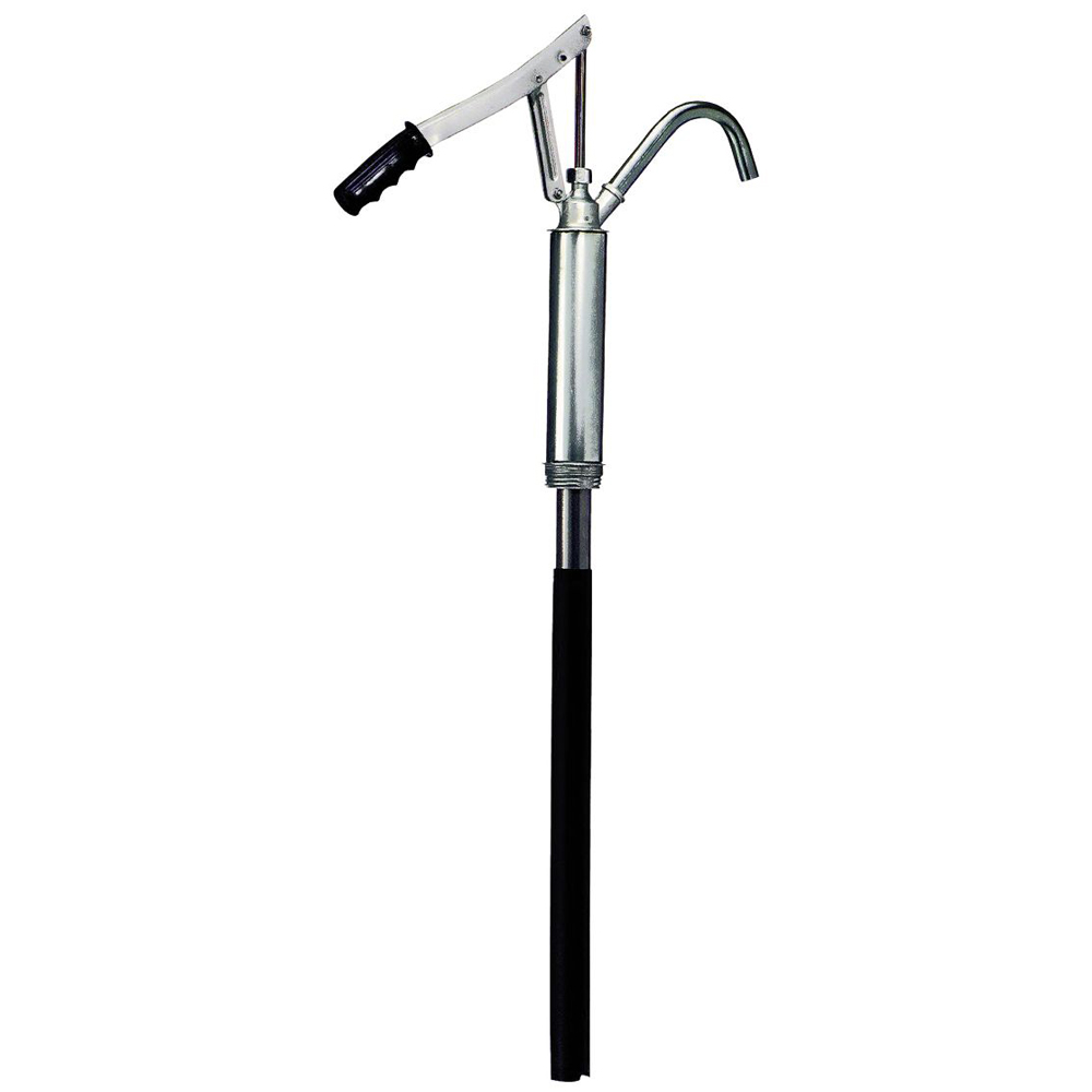 Stahlrohr-Fasspumpe mit Auslaufkrümmer für Fässer 60/200/220 l, Teleskop-Saugrohr 480-900 mm, Fördermedien: Öle bis SAE 90, selbstschmierende nicht aggressive Medien, Frostschutz unverdünnt, Heizöl, Diesel, Petroleum, Förderleistung: 0,3 l/Hub