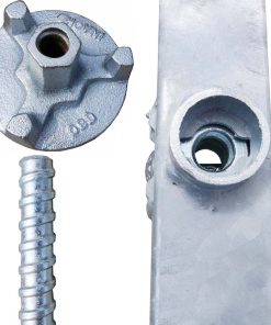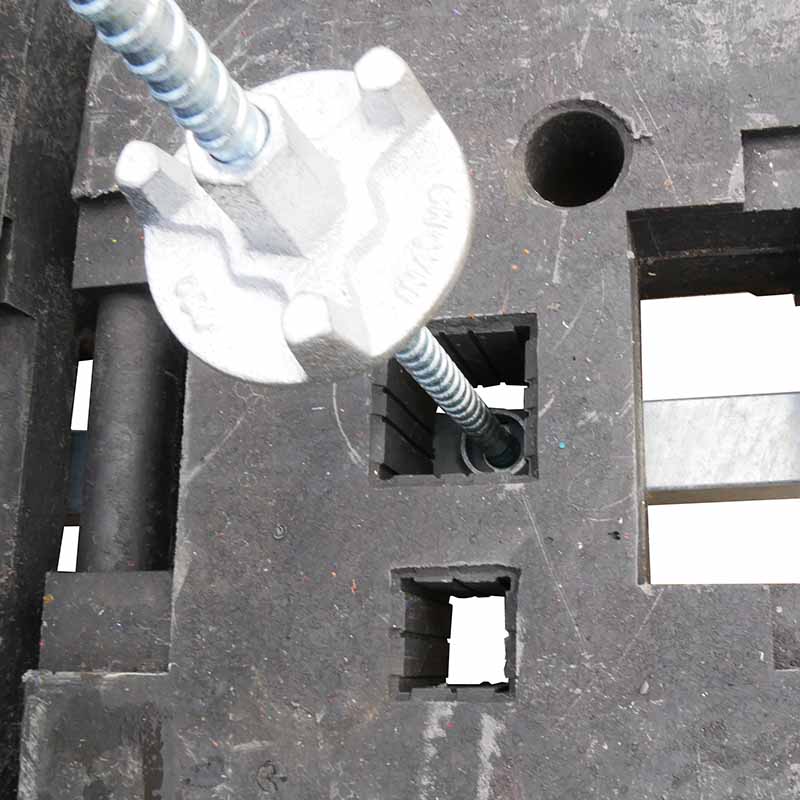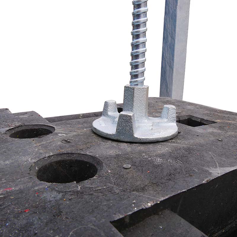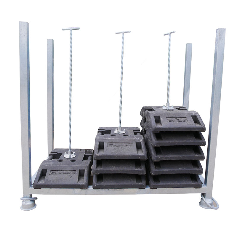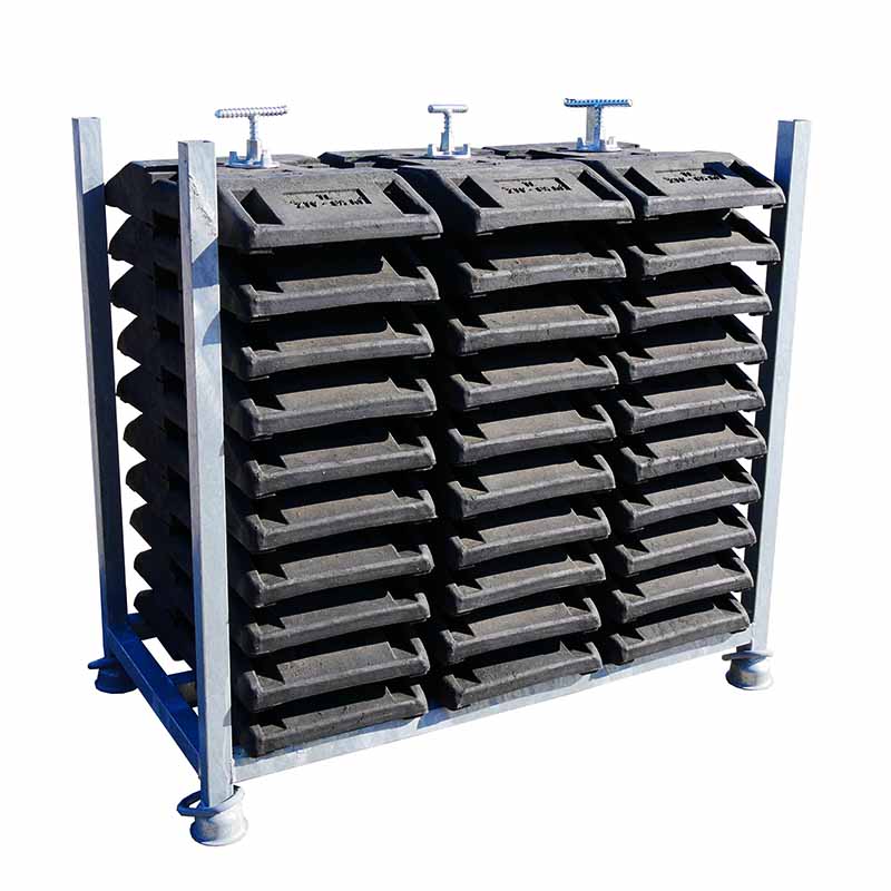 Die Stapelpalette kann bis zu 30 Fußplatten in Stapeln á 10 Stück aufnehmen. Für jeden Stapel gibt es einen Sicherungsanker, der von oben durch die Fußplatten gesteckt wird und so ein Verrutschen verhindert.