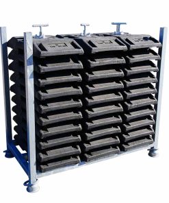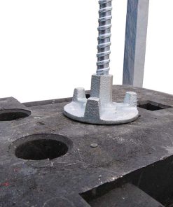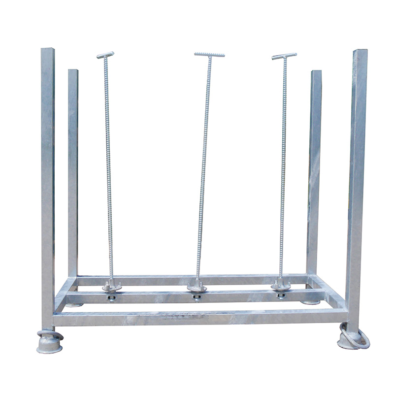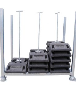 Mit der Stapelpalette für 30 Fußplatten mit Sicherungsanker lassen sich die Fußplatten an dem Gestell fixieren und so besonders gut für den Transport sichern.