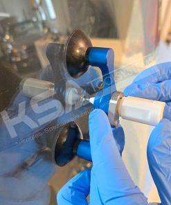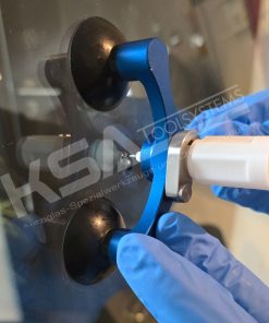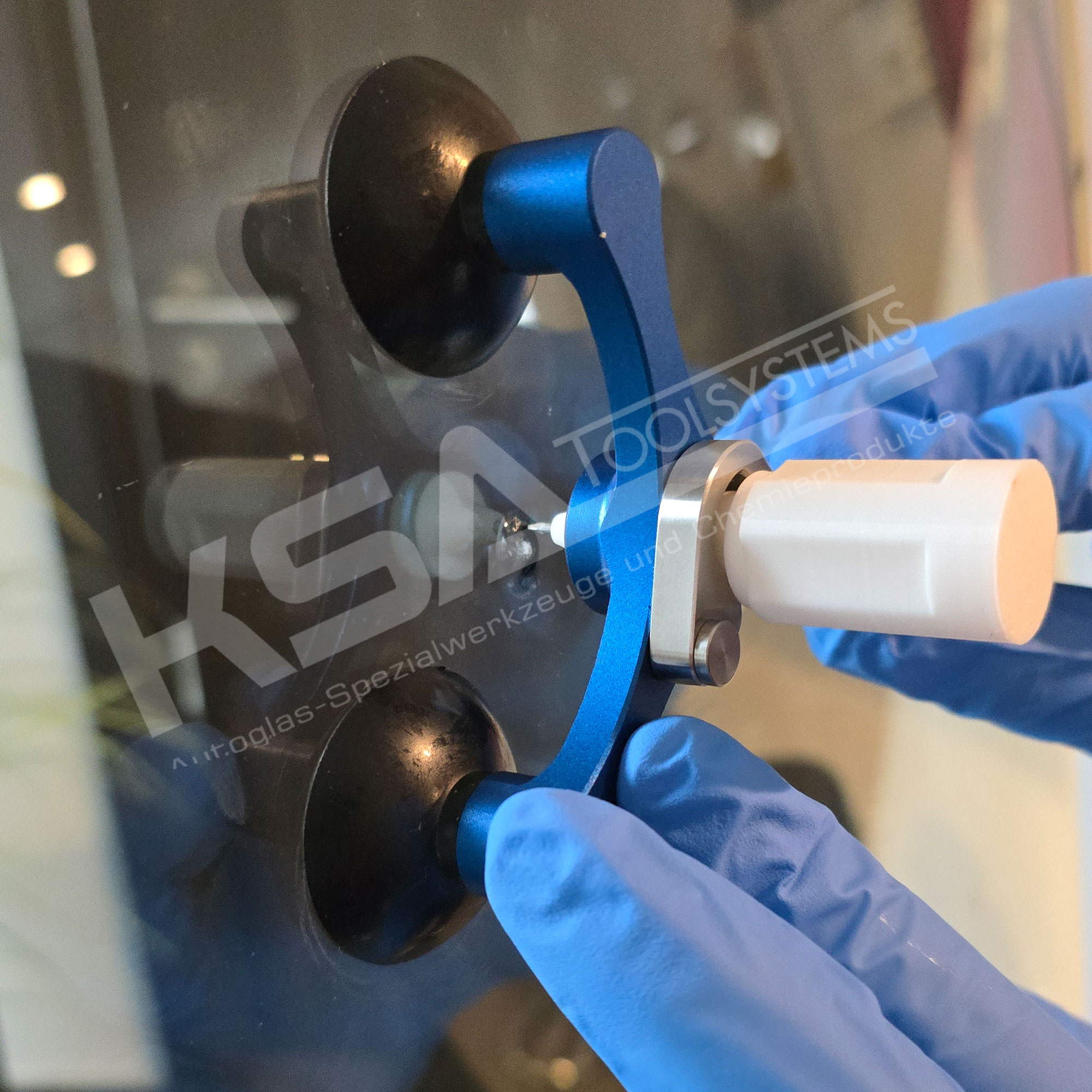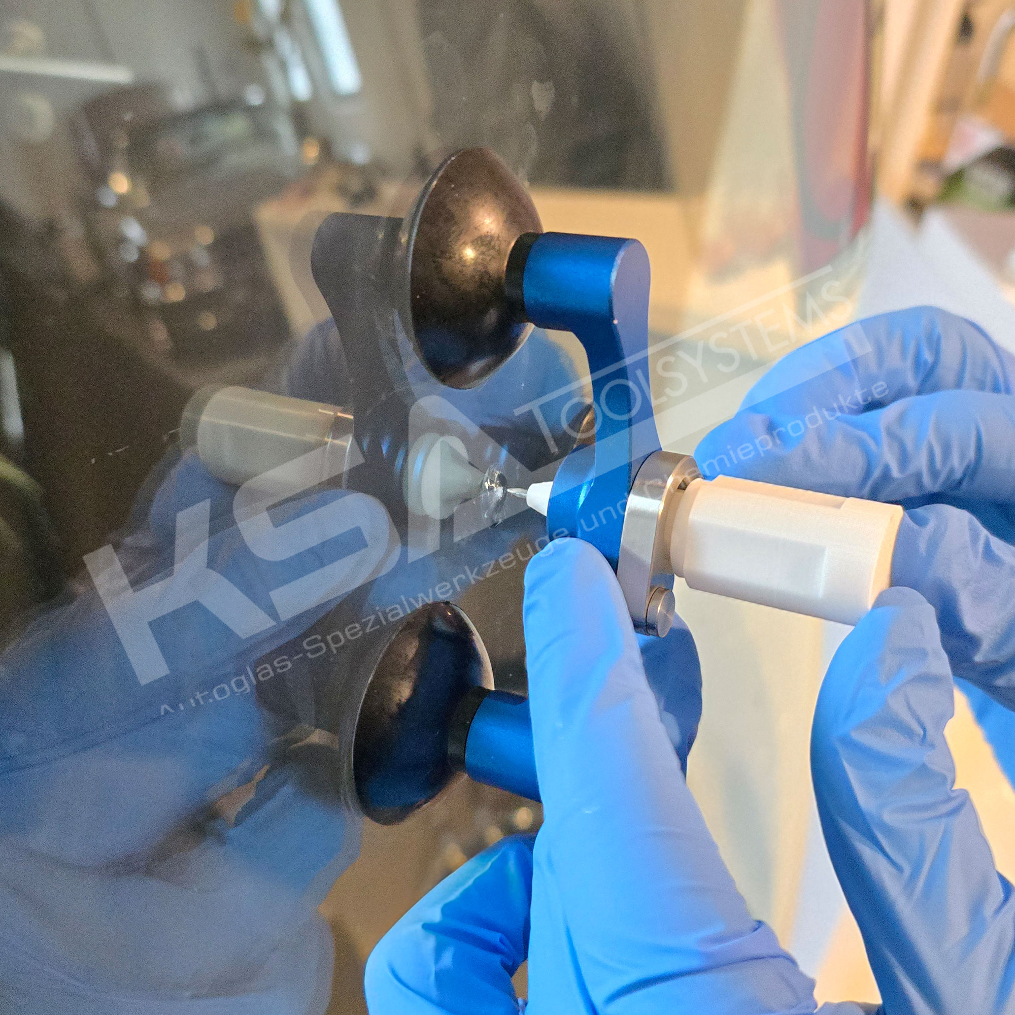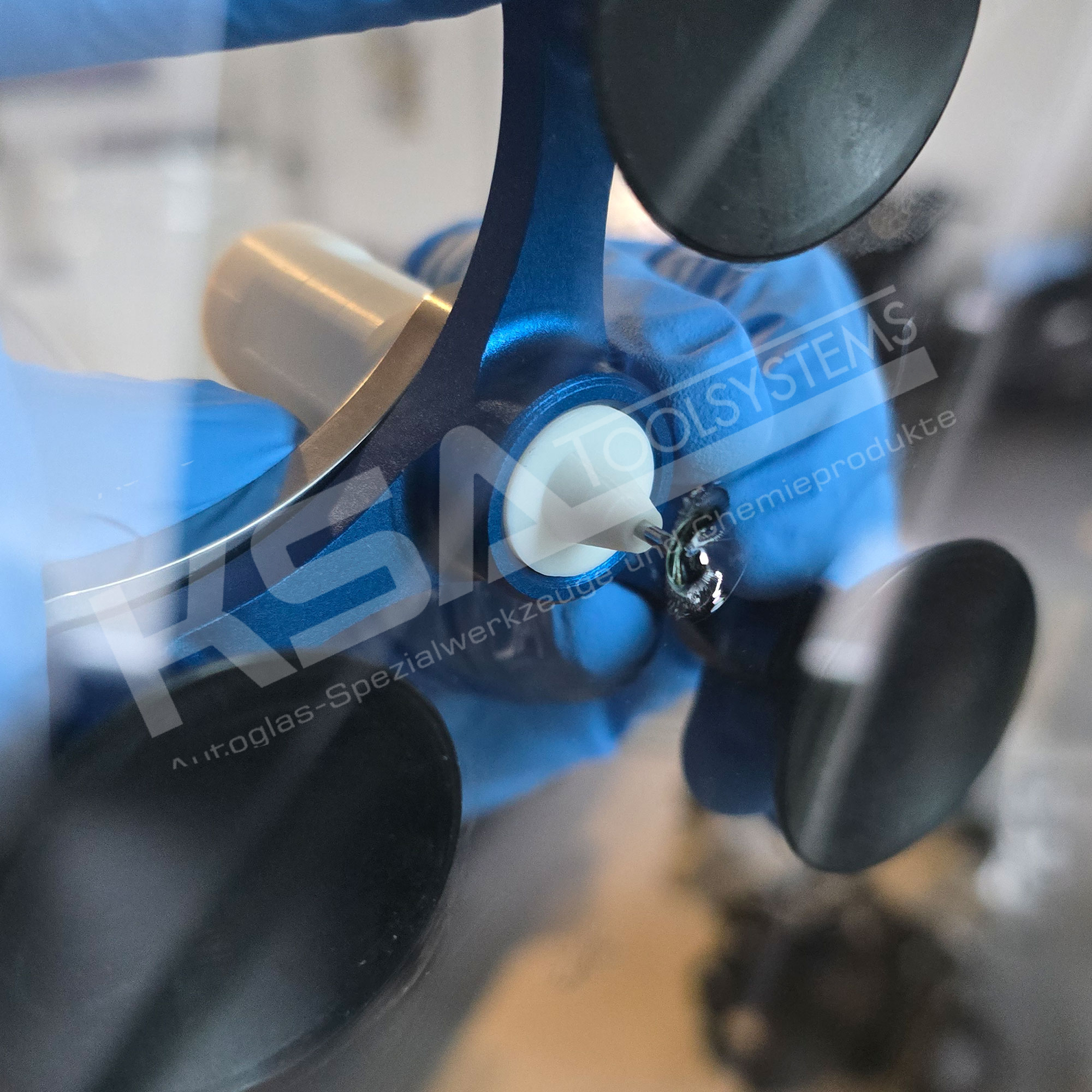 Zentrierhilfe in den Injektorfuß einspannen und die Standfüße leicht befeuchten (z.B. mit KSA GlassCleaner um ein einfaches verschieben zu gewährleisten). - Positionieren