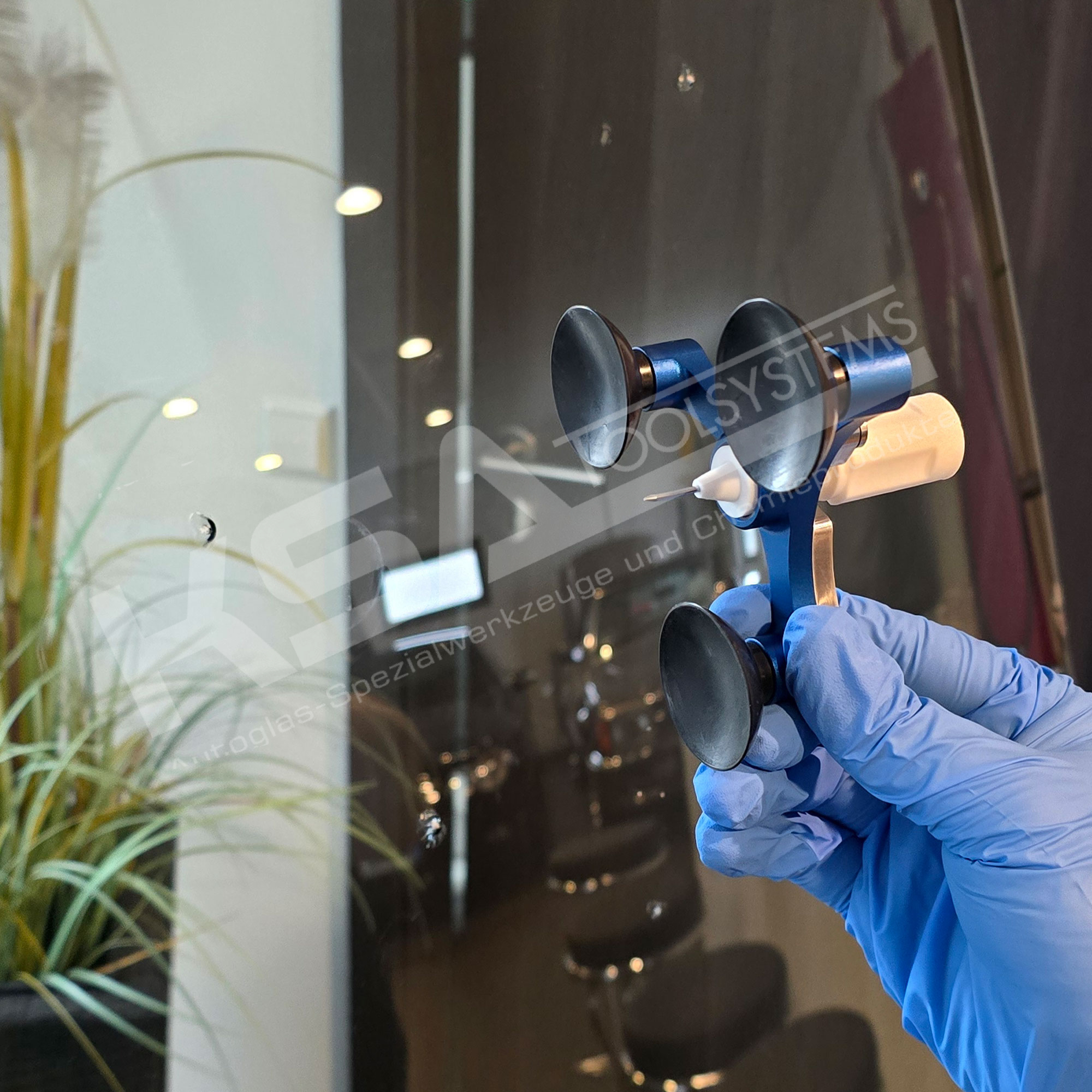 Die Steinschlag Zentrierhilfe mit magnetischer Federung ist das perfekte Werkzeug für Autoglas-Reparaturen. Sie ermöglicht das schnelle und präzise Auffinden des Einschlagpunktes und sorgt für eine perfekte Positionierung des Injektorhalters über dem Steinschlag.