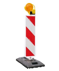 Achten Sie darauf, dass die Fußplatte vollständig aufliegt. Leitbaken und Schilder sollten quer zur langen Seite eingesteckt werden, um die Kippgefahr zu reduzieren.