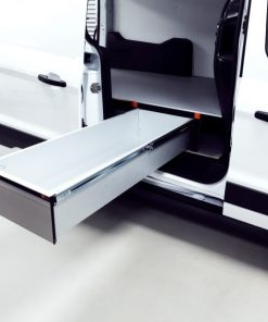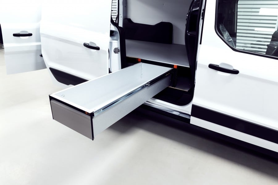 Die langen ausziehbaren Schubladen geben einen guten Überblick über Ihr Material und Ihre Werkzeuge und sorgen für Ordnung und eine sichere Verstauung. Dieses Unterflursystem besteht aus 3 Schubladen, von denen 2 nach hinten herausgezogen werden und 1 durch die Seitentür ausgezogen wird. Das Unterflursystem ist geeignet für Ford Connect L2H1 ab Baujahr 2014.
