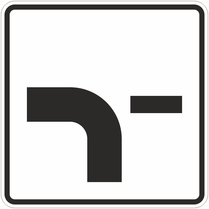 Das Verkehrszeichen 1002-13 „Verlauf der Vorfahrtstraße an Einmündungen – von unten nach links, Einmündung von rechts“ ist ein Rechteckschild mit schwarzem Rand. Auf weißem Grund ist in Schwarz das Sinnbild für „abknickende Vorfahrt“ abgebildet: ein breiter Balken mit halbrundem Verlauf von unten nach links für die Vorfahrtstraße sowie ein horizontal verlaufender schmaler Balken für die Einmündung der nachgeordneten Straße von rechts.