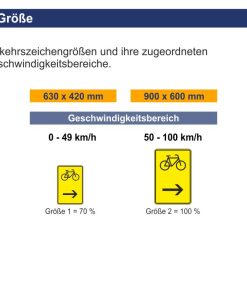 Das Verkehrszeichen 422-26 „Wegweiser für Radverkehr, hier rechts“ ist ein gelbes Richtzeichen mit dem schwarzen Piktogramm eines Fahrrads und einem nach rechts zeigenden schwarzen Pfeil darunter. Das Rechteckschild wird hochkant angebracht.