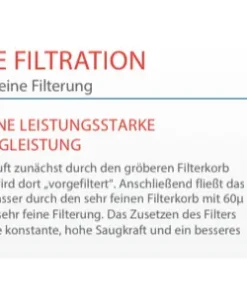 Durch den 60 Mikron Filterkorb wird Schmutz und kleinste Partikel aus dem Wasser und den jeweiligen Reinigungsbereichen gesammelt und heraus gefiltert.