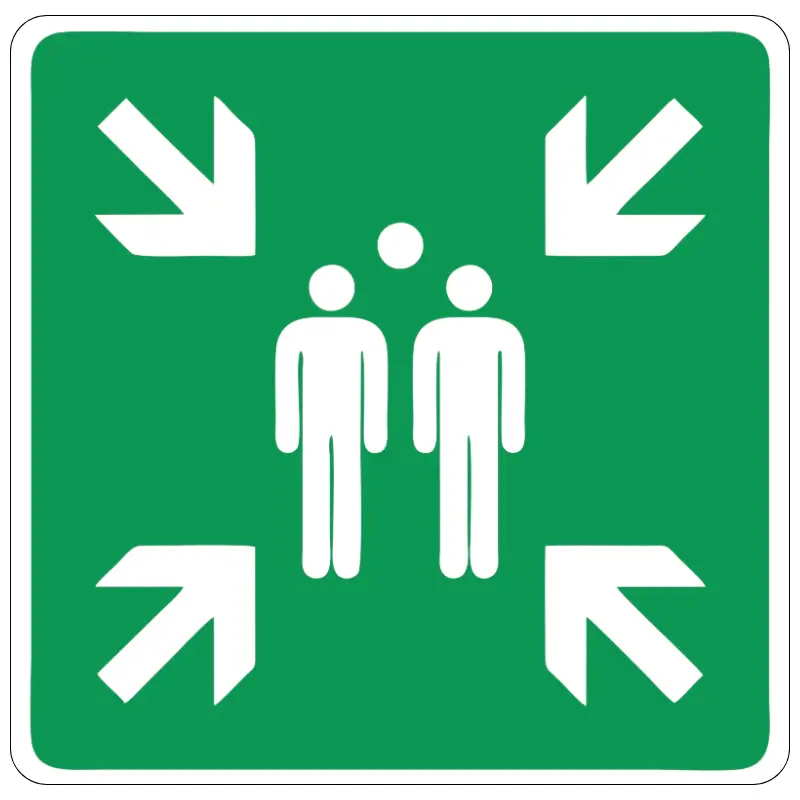 Bedeutung: Das grüne Schild Sammelstelle kennzeichnet einen Sammelplatz für den Notfall. Es signalisiert: Hier ist ein sicherer Bereich, an dem sich flüchtende Personen bei einer Gebäudeevakuierung, zum Beispiel bei einem Brand, einfinden sollen. Am Sammelpunkt kann überprüft werden, ob sich alle im Gebäude befindlichen Personen in Sicherheit bringen konnten und welche weiteren Maßnahmen zu ihrer Betreuung und sicheren Evakuierung getroffen werden müssen.