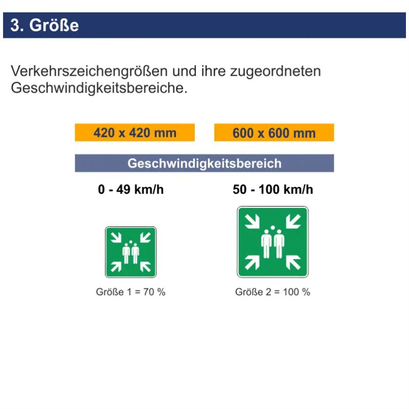 Einsatz: Die Kennzeichnung einer Sammelstelle spielt insbesondere beim Brandschutz eine wichtige Rolle. Sie erfolgt nach den Technischen Regeln für Arbeitsstätten ASR A1.3 „Sicherheits- und Gesundheitsschutzkennzeichnung“. Um Sammelstellen zu markieren, wird das Sicherheitszeichen E007 „Sammelstelle“ gemäß DIN EN ISO 7010 verwendet. Das Rettungszeichen muss gut sichtbar in einer entsprechenden Höhe angebracht sein, sollte groß genug und von allen Seiten erkennbar sein.